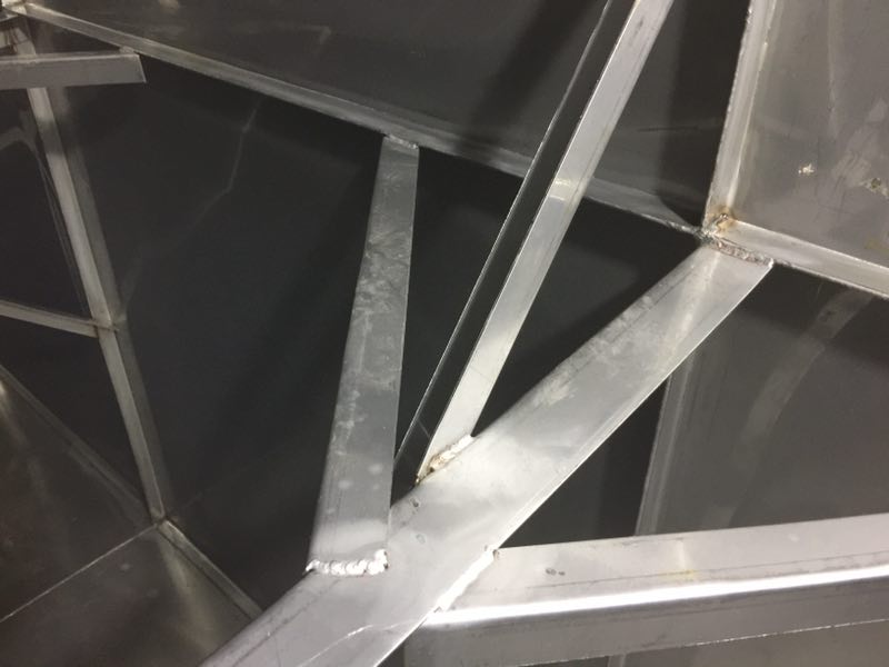 斜拉主要的作用在于分擔(dān)主拉筋的拉力,進(jìn)一步對(duì)水箱板進(jìn)行穩(wěn)固,切成500mm的長(zhǎng)度,連接在水箱與主拉之間。形成龍爪式,常規(guī)尺寸為4cm*1cm厚度一般以靠近頂部的側(cè)板厚度為基準(zhǔn),連接處必須進(jìn)行滿焊處理。