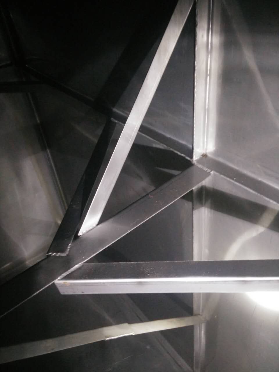 主拉主要作用是防止水箱變形,厚度一般采用靠近底板的側(cè)板厚度為基準(zhǔn),規(guī)格為4cm*4cm。其焊接間距一般為1000mm一條,大型水箱特別是高度超過3米以上的。其間距應(yīng)該為500mm一條,連接處必須進(jìn)行滿焊處理。